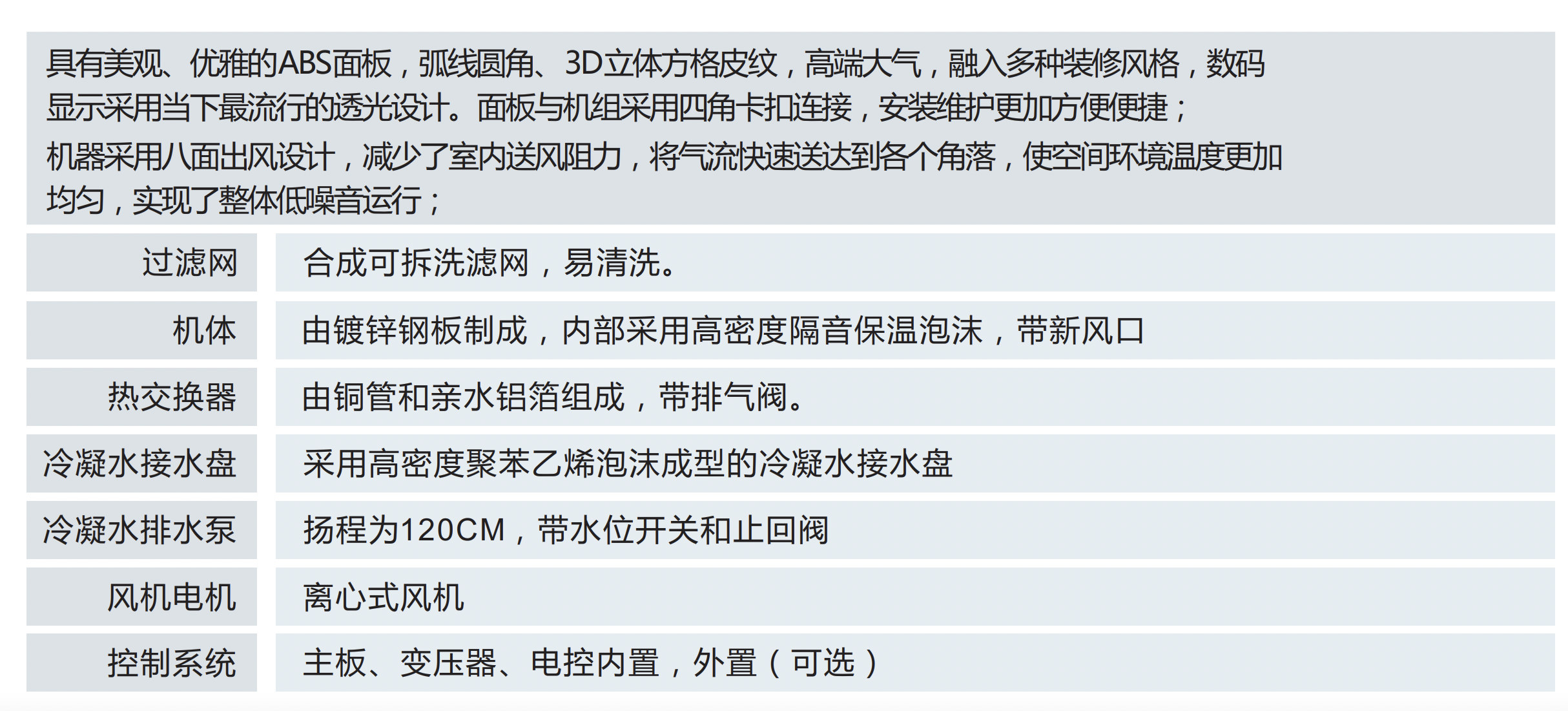 具有美觀、優(yōu)雅的ABS面板,弧線圓角、3D立體方格皮紋,高端大氣,融入多種裝修風格。面板與機組采用四角卡扣鏈接,安裝維護更加方便便捷。